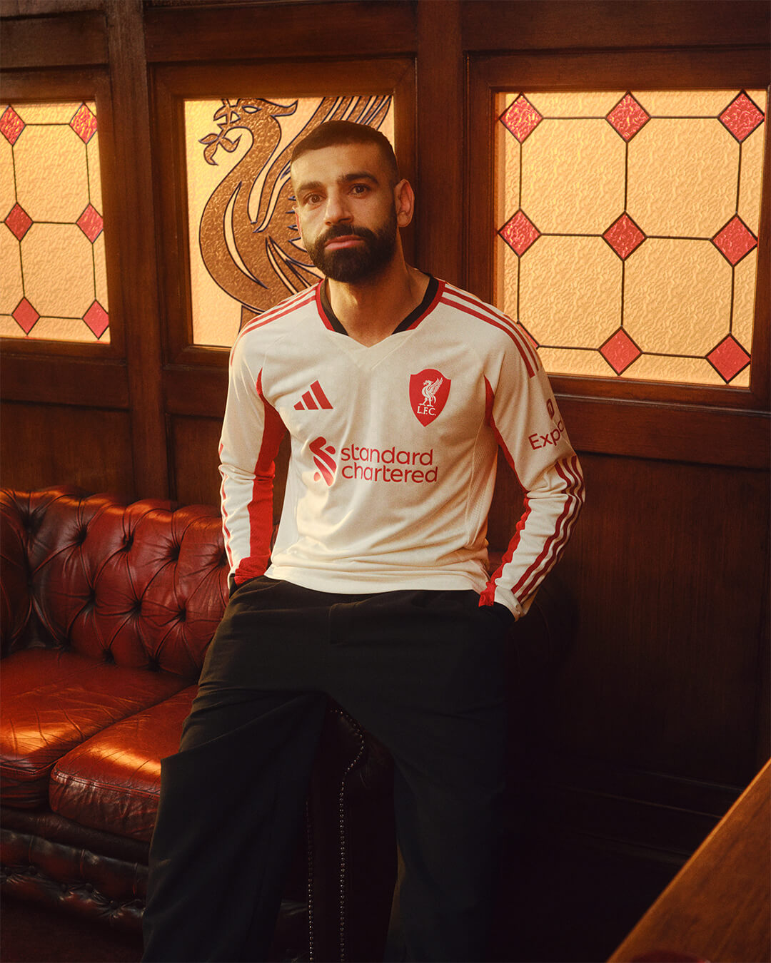 As três listras são vermelhas, assim como o logo da adidas e os patrocinadores, assim como o escudo que abriga o pássaro do Liverpool, inspirado no formato da antiga arquibancada principal de Anfield, de 1906.