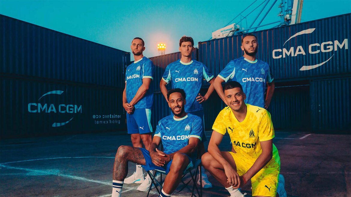O logo da PUMA no peito e nos ombros, bem como o patrocínio da “CMA CGM”, empresa francesa de transporte marítimo, sediada em Marselha, que também é uma das homenageadas no lançamento, aparecem em branco.