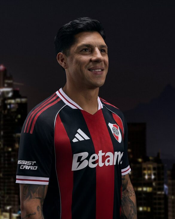 O escudo do River Plate está no lado esquerdo do peito, enquanto o logo da adidas aparece em branco, assim como os patrocínios nas mangas.