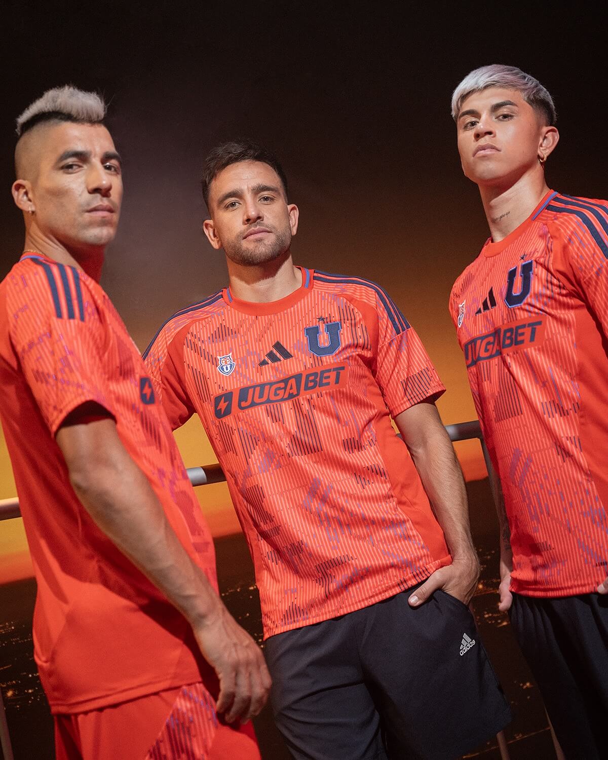 A camisa reserva da La U é baseada no template Tiro24 da Adidas e traz um tom de laranja bem chamativo como base, saindo do tradicional branco dos mantos reservas. Sobre ele, vão diversas linhas verticais no corpo e mangas, além de grafismos geométricos pelo corpo, em azul marinho e celeste.